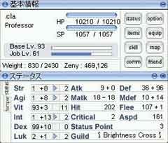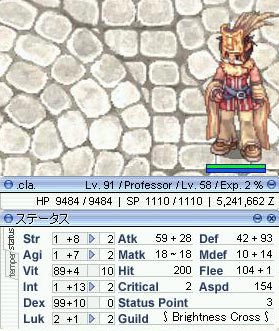 やっぱり自分の最終ステは転生前から考えていた↓のステかなぁ STR:6 AGI:31 VIT:96 INT:1 DEX:99 LUK:2・・・(T_T 基本的にはDEX-VITでサブでAGI、あまりSTRって感じですね。 LUKは・・・無かったことで。。 対人型の教授なら迷わずDEXは99でしょう。 教授(セージ)のスキルは早く詠唱できたほうがいいスキルばかりです。 教授は比較的DEX補正が高いので無理の無い装備でも無詠唱が可能です。 VITですが、やっぱり死ににくいってのが一番大切ですよね。 HPは高くなるし、ダメージも減ります。状態変化もしにくくなるしね。 クリエイターのアシッドデモンストレーションが痛くなるのが恐ろしいですが、 ほかのメリットに比べれば仕方の無いことだと思います。 JobLv63のときに補正が4付くので96で止めても100になり スタンや毒、呪い、沈黙がきかなくなります。 サブステはSTRかINTかAGIになると思いますが、 STRだと積載重量が多くなるのが最大のメリット 回復剤を多くつめれば死ににくくなります。 正直これが正解な気がします。 もしSTRを振るんであればその回復剤の多さを活かすために VITはMAXの99まで振るのがいいでしょう。 VITが99であれば装備しだいで、あの厄介な高DEX阿修羅を耐えることが可能だそうです。 高DEXはハイドの目押しが間に合いませんからね(T_T 逆にそうじゃなければ交わしたりできるから実際阿修羅にかなり強くなると思います。 STRは1ポイント上がるたびに最大積載量が+30になります。←記憶では・・ DEX99・VIT99だと最大でSTR25まで行くので、 24×30=720の増量が可能です。 これは白ポで言うと48個分、 マステラなら240個分に相当します。 次にINTですが、 これを振るのはほとんどMAXSPの確保のためになるでしょう。 INTはDEX・VITを優先させるとせいぜい25~33の間でしか触れません。 この程度のINTではFD・FWは当たらない可能性が高くそこのところは見込めないようです。 ただ、予測ですがMBrを先に決めることができれば、うまいこと当たるような気がします。通常MobでNBがミスになるてきもMBrを決めれば当たるようになります。 しかし、この場合そもそもINTに振る必要もありません。 ちなみにINT33でSP1500ちょいといったところです。 よっぽどの阿修羅で無い限り余裕で充填できます。 最後にAGIですが、これはモーションディレイを減らすために取ろうと思いました。 高DEXの教授がさらにスキルの回転を上げるためにはASPDを上げるしかありません。 たとえば、杖装備でスキルを使うのと素手+HSPでスキルを使うのでは、連射性能が目に見えて違います。 特に対人ではほんの一瞬で決着がつくこともあるのでよりテクい動きが可能になると信じています。 上の最終ステ候補だとAGI31+補正+支援=52なので 短剣+HSPでASPD170 素手+HSPでASPD174 になる計算です。 あ~、早くAGI振れるようにならねぇかなぁ~ Lv95以上にならないと振れないよ(T_T つーか、マジLUKなんとかしてくれ・・orz |