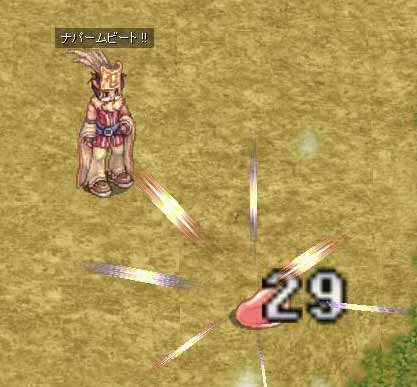 この弱さ!最高にイカスぜ!! ナパームビートは魔法の中でもお気に入りなんだよね~ あの効果音と速さがいい感じ これを使ってるとβのころを思い出すよ でも昔はもっとダメージの判定が早かった気がするな それはさておき、俺のNBはLv10 倍率1.7倍でスキルディレイは0.5秒! 1.7倍ならさすがにあたるかな?と思ったけど やっぱり計算機で計算したとおりほとんどMISSります (ダメージが0になっちゃうんですね) タゲとりでMISSとか出ると嫌な感じだね でも、氷を割るのには重宝してるね もともとそのためにとったわけだけど 氷なら必中だし微妙な範囲もたまに巻き込んでくれていい感じ ディレイも少ないから敵によってはSGの氷中に3匹タゲれます FBlと迷ったけどやっぱりこっちのほうがいいかな 回転が速いのがとってもいい FBlだと蜘蛛の拘束を解除しちゃうしね それに0.5秒のディレイだと予約入力でディレイを感じさせないし けん制に最適、当たる敵なら生命力変換の間に入れても全然苦にならない いやぁほんと、これ10とった方がいいですよ 見てのとおり1.7倍だからってポリンすら確殺できないけどね~orz ※写真はナイフを装備したダメージですが、 杖を装備したからといって、ポリンは倒せません・・ |