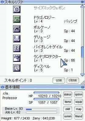 カローラという言葉を耳にしなくなってから久しいですが、最近は同じキャラでもステータスやスキルによってかなり個性が出てきているキャラもあるようですね。 しかしGv教授はだいたいベースとなるステータス・スキルは依然とそうかわらなそうです。 DEXを極振りし、VITを100以上にし、、、問題はここからですね。 VITを極にし耐久力を高める人 STRを振ってアイテム(特に回復)を多めに持てるようにする人 AGIに振って手数を増やす人 INTを振ってMSPを増やしサポートに徹する人 (もしかするとVITを低めにすれば最近の装備と合わせて、FDとかを役立てられるようになるかもしれませんね) そして、LUKに振って絶望するひと。。。orz 数年前にも書きましたが、やっぱり変わらずclaはAGI派ですね。 でも最近は新装備が出てきたので、目標ステが若干変わりました。 装備の遅れもだいぶ取り戻せてきたので、本格的にLv上げに移ろうと思い、 忘れないようにここにメモっておくことにします。 Base99・Job70 STR:9+6 AGI:32+9 VIT95+4 INT:1+13 DEX:99+11 LUK2+2・・・(T_T +はJob補正 以前と比べVITを1減らしたことでAGI+1・STR+3の違いがあります。 (もちろんLUKの誤振りがなければSTR10にしたい限りですorz) VITは現在でもHP・回復補正と状態変化でかなり満足しています。 この値になってからVIT関連の状態変化にはかかったことがありませんし、 装備補正で常時100以上になりそうなので問題ありません。 それよりもたとえば属性鎧を装備することになって積載重量が多く必要になったことなどがあり、STRを少しでも増やそうと思いました。 AGIは1くらいだとあまり変らなさそうですが、この値だといろいろな場合においてASPDの整数が繰り上がっていい感じです。 ASPDは先日の記事にも書きましたが、特に杖を持った時のキャラ性能が飛躍的に上がるのではと期待しています。 今度こそ「絵に描いた餅」にならないように、精進していきたいものです。