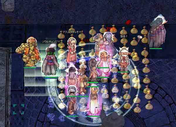 転生職しか行けないダンジョンということもあり、 メンバーがなかなか集まらないのが現状ですね。 途中メンバーの入れ代わりがあり、最終的には LK・パラディン・アサクロ・HWIZ2・Hプリ3・阿修羅2・教授2 教授が2というのはなかなか無いんですが、 おかげでブラギがなくても阿修羅をうまく回せていたと思います。 それもあって、安定どころか物足りなかった気もします。 イメージではもっと敵が多いのかと思っていました。 相方の教授はclaとは正反対でINT>DEX型の教授です。 なのでSPが有り余っています。 一応分担はWIZ・プリなどの高SPキャラのSP充填をと話たんですが、 やっぱりブラギが無いと1人で阿修羅2人とか回せるわけはありませんでした。 結局やれるほうがやるって形で阿修羅を回しました。 ソウルチェンジのターゲットがかぶることもしばしばありましたが、 この場合絶対的なSPの量が変わらないため、意外と気にならない範囲でした。 (後からチェンジした方は結局、ほかの阿修羅に対して十分なSPがもどってきますからね) もし、この場合ブラギがあればclaが阿修羅全員担当で、相方は後衛職といった分担がよかったでしょう。 DV型の場合SPの変換効率が高くこのときの装備だと1回の変換で300↑(Lv3変換)回復し、MAXSPまで回復するのに変換4回ですみます。 このときHPは6kくらい残る形になります。 一方ID型の場合、聞いたところによるとclaと相方ではHPが2倍程度違いますので 阿修羅の充填に必要なSPを補うまでに7回程度の変換が必要になります。 残るHPは1200程度でしょうか これだと赤ゲージになるかどうかというところだと思います。←なるかな? 阿修羅は頻繁に使いますから、DV型の教授が充填したほうが安全ですね。 逆にHPの多いWIZ・プリにはDV型の教授ではSPの絶対量が足りないため、逆に相手のSPを減らしてしまう可能性が高いです。 残念ながら最上階には行かず、手前で戻ってしまいましたが、 そのうち最上階にも行ってみたいと思います。 予定のある方はぜひさそってくださいm(_)m