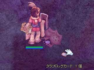 アイテムはそんなに真剣に拾ってたわけでもありませんが、これだけあるとなんか愛着がわきますね。 本当ならすぐにでも売りさばいて風原石代の元を取りたいところですが、いまだに倉庫の中です。 中央で燦然とした輝きを放つタラフロッグカードですが、 実は2枚連続でGETしていました><b 2枚目はハイスピードポーションと風付与が切れるまでに出たものです。 いわゆる時短中連チャンってやつですね。 狩ったタラフロの数を考えれば2枚出て当然ですが・・。 しかしこの、カードが地面に落下した瞬間ってのは、こうやってSSで見ても最高にテンション上がりますね。 これがあるんでROはやめられません。 あと、昨日UPした壁紙ですが、標準比率のものが良いという話をいただいたので、今日もUPします。 タラフロッグに目が行きがちですが、密かに装備しているオークヒーローの兜もポイントです><b |
